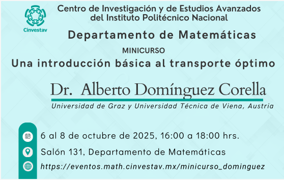 Minicurso Una introducción básica al transporte óptimo Departamento de Matemáticas Cinvestav Event date: 06/10/2025 04:00 p. m. - 08/10/2025 06:00 p. m. Export event Print