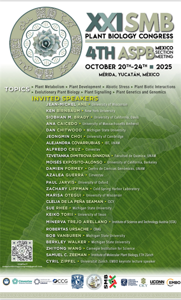 XXI SMB Plant Biology Congress Dr. Alfredo Cruz Ramírez, Unidad de Genómica Avanzada, Azalea Guerra García, Biotecnología y Bioquímica Cinvestav Irapuato Event date: 20/10/2025 09:00 a. m. - 24/10/2025 08:00 p. m. Export event Print